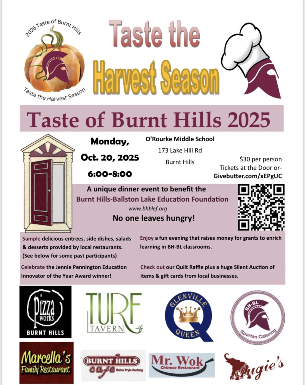 Join us October 20th from 6 to 8 PM for the Taste of Burnt Hills at the O’Rourke Middle School where you can enjoy food from many different local restaurants & caterers for only $30 per person.